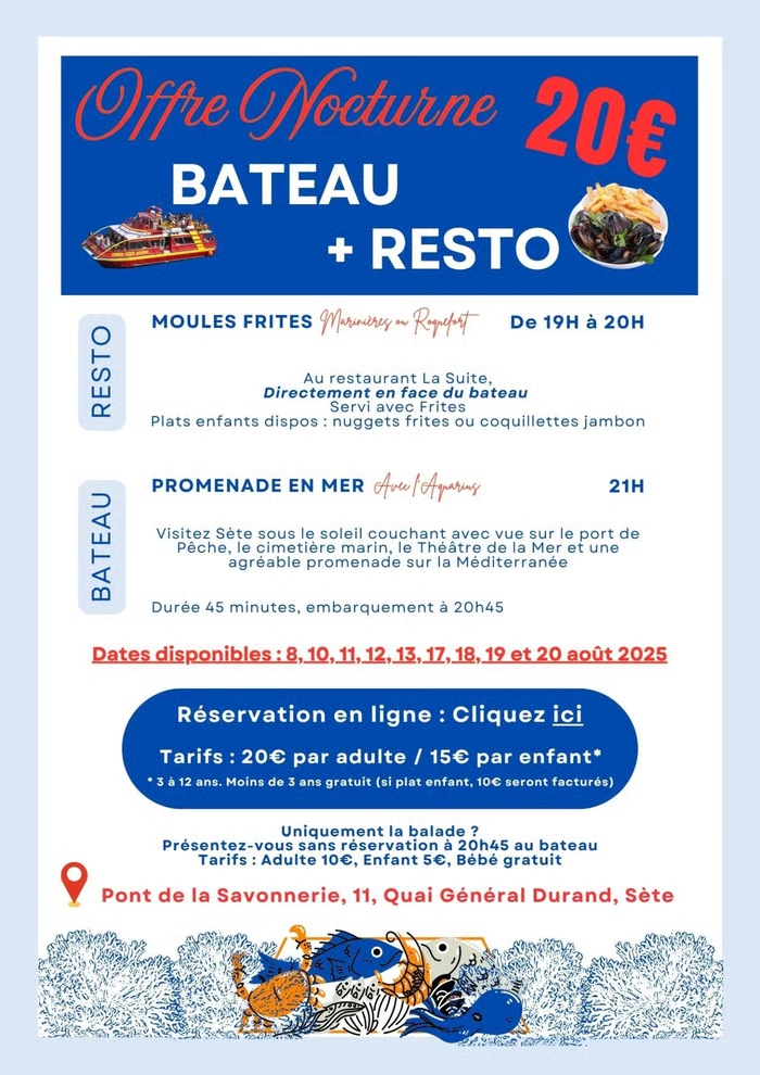 Le DUO Seiche / Gambas à seulement 14 €, grâce à votre ticket Sète Croisières. Des restaurants idéalement situés en face des bateaux avec terrasse abritée et un large choix de spécialités sètoises.